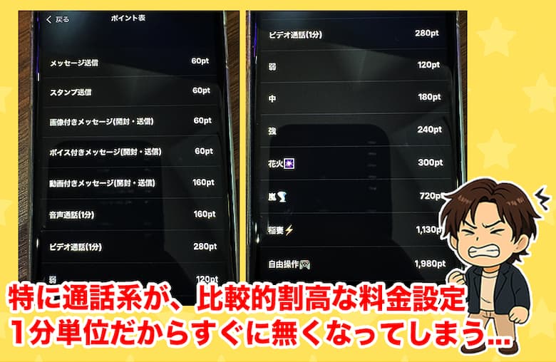 しかもホエールは、メッセージ送信60ポイント、音声通話1分160ポイント、ビデオ通話1分280ポイントで割高な料金設定だから、全体的に男性側の負担やリスクが多かったな。