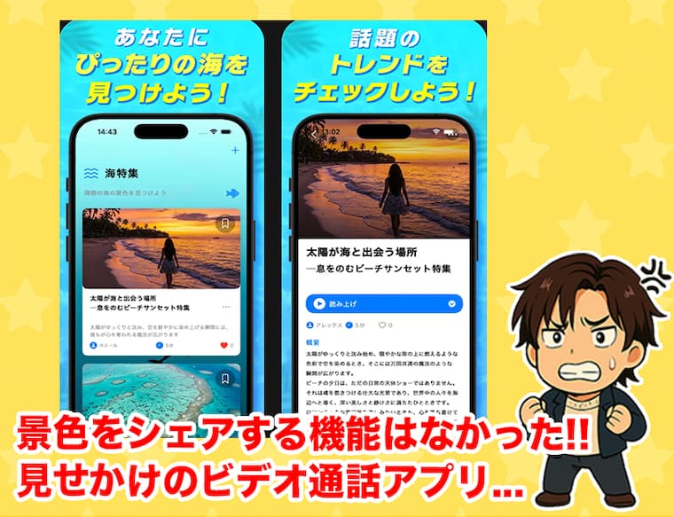 星野確かに「景色がきれい」「海好きと繋がりやすい」って声があったけど、そんな海をシェアする機能もなければ、アプリ内で景色の話をしている人なんていなかったからね...。