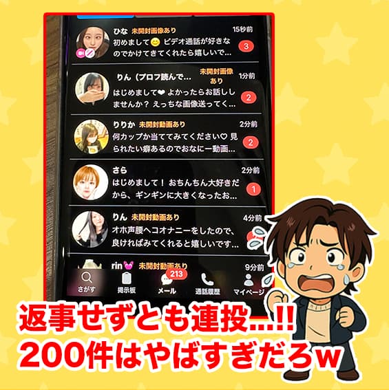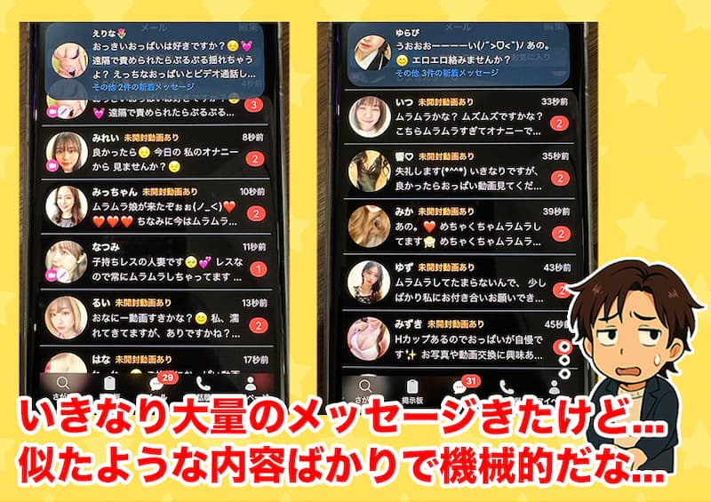 登録してすぐ大量メッセージが来る感じとか、やたら距離感が近いとかは、まさに俺が感じたことと同じだね。