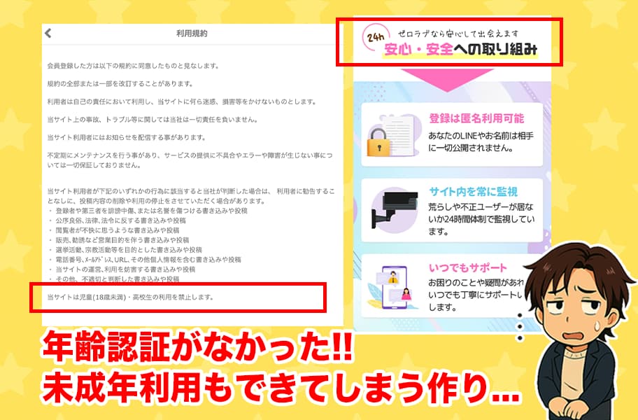 そもそも、ゼロラブの紹介ページでは「安心安全への取り組み」「未成年利用の禁止」と書かれていたけど、実態としては年齢認証・本人確認もなく、ただ書かれているだけ!