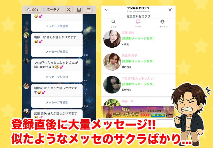 - 登録直後からサクラや業者と疑われる大量メッセージが届く