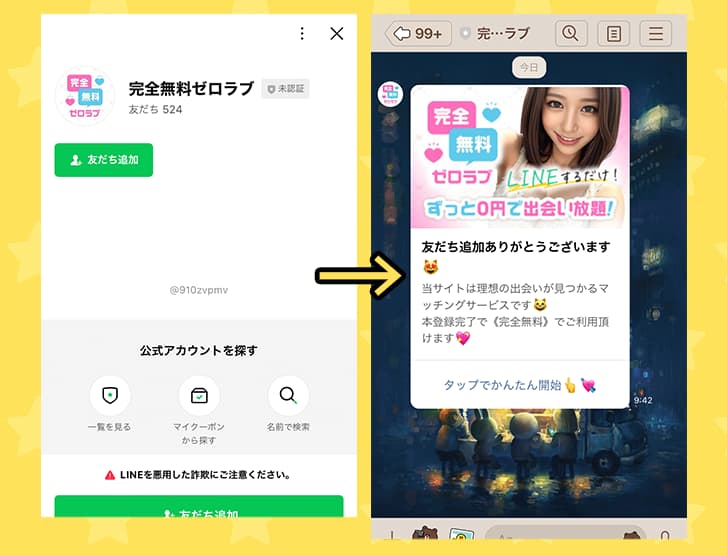 俺も最初は、完全無料+LINEだからちょっと覗くだけでもアリかなと思ってよく登録しちゃうんだけど、ほとんどが危険なサイトだったから気をつけよう!