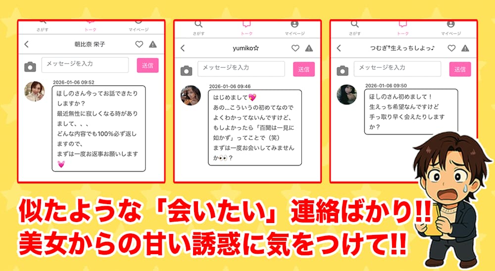 しかも、プロフィールの写真は美人ばっかり、紹介文には「すぐに会えます」みたいなフッ軽アピールだらけでめちゃくちゃ不自然だし...。