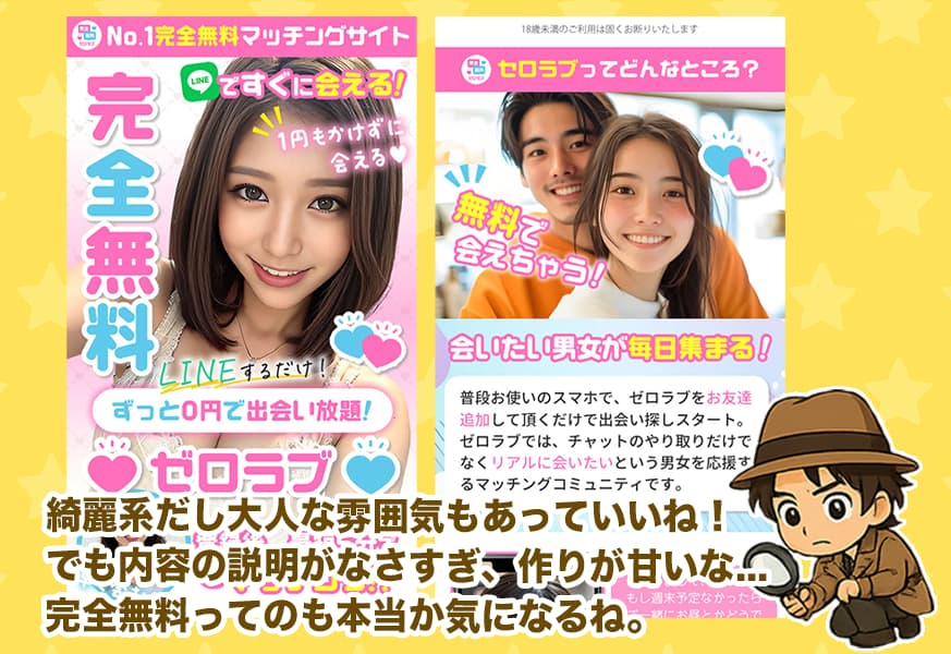 ゼロラブとは、LINEを使ってやり取りする完全無料をうたった出会い系のマッチングサイトと紹介されているね。